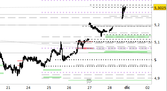 Future Copper, grafico a barre da 30 minuti. Prezzi al 28/11/25, ore 18.38, last 5.3025