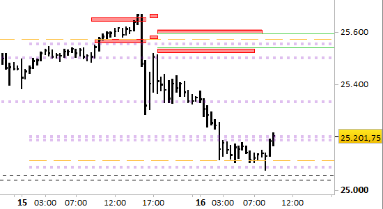 I prezzi hanno intercettato il primo target ribassista a 25205.00, ma non il principale a 25060.00.