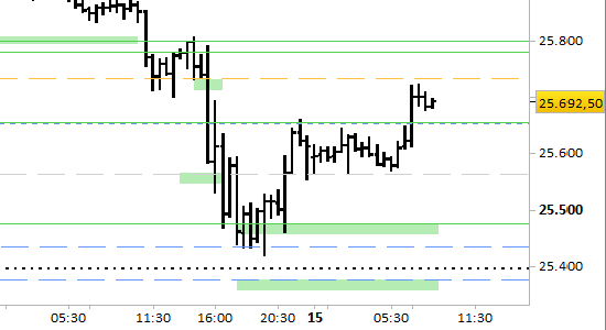 La posizione long aperta ieri a 25476.00 è stata chiusa sul target principale a 25708.00.
