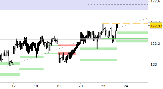 Fino all’aggiornamento di domani (= brevissimo periodo) ci sono le condizioni per il test pieno della resistenza di medio termine, in quanto le proiezioni indicano un obiettivo a 122.57. Le potenzialità di allungo nelle prossime 1–2 sedute poggiano sui nuovi supporti aggiornati a 122.29/32 e 122.20/23, punti di reazione in caso di arretramenti. Il segnale long resta...