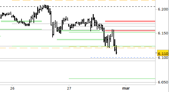 future Eurostoxx50, grafico a barre da 30 minuti. Prezzi fino al 27/02/26, ore 18.49, last 6110