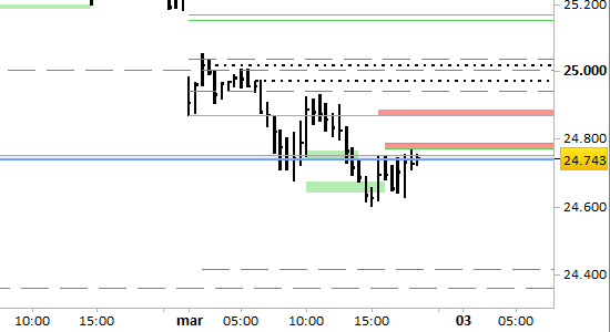 E.mini Nasdaq100 intraday: prezzi sopra le resistenze dailye.mini future nasdaq100 scad. 03/26: I prezzi hanno effettuato un ampio e inatteso recupero fra 24694.50 e 25078.75, interrompendo il segnale ribassista di breve periodo. Ci sono ancora margini di recupero fino a domattina...