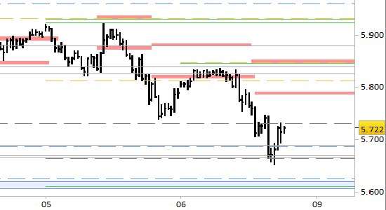 Sono stati raggiunti entrambi gli obiettivi di breve periodo a 5731 e 5690, con minimi toccati a 5653. Considerata la relativa vicinanza assunta dai prezzi con il supporto di medio periodo a 5605/5625, da questo momento attenderemo l'eventuale formazione di indicazioni di rimbalzo. Fissiamo livelli di verifica a 5745/5747 (resistenza) e 5650 (supporto) e rimaniamo per il momento in osservazione.