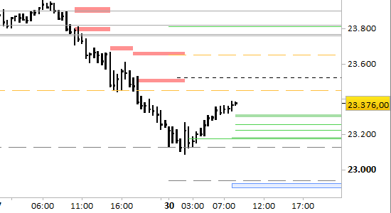 Dopo l'ultimo commento i prezzi si sono mossi ancora al ribasso, fra 23812.50 e 23532.00. È stato oltrepassato il primo target di breve periodo a 23650.00, ed è stato fortemente avvicinato il target principale di breve a 23520.00/23525.00. La resistenza principale si è abbassata fino al prossimo aggiornamento a 23690.00/23700.00. Il segnale short resta attivo solo con rilevazioni stabilmente inferiori a 23700.00.