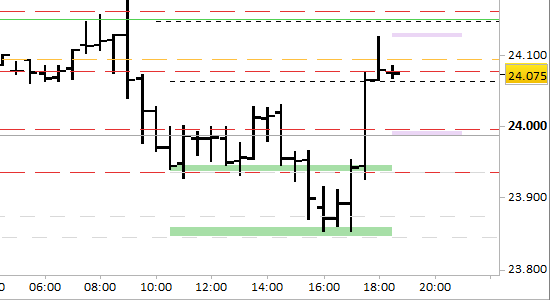Ci aspettiamo una provvisoria stabilizzazione dei valori fra 24125/130 (resistenza aggiornata fino a domattina) e 23985/995 (supporto aggiornato fino a domattina).