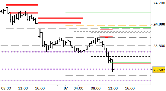 Conserviamo la posizione short aperta a 23815. Stop-profit sopra 23646 senza attendere alcuna conferma.