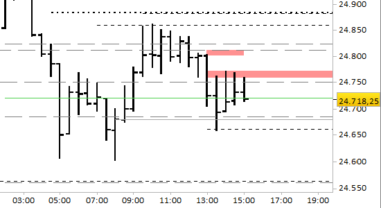 Conserviamo la posizione short aperta a 24730.50. Stop-e-reverse sopra 24777.00, senza attendere alcuna conferma.