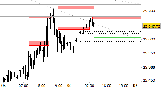 Conserviamo la posizione short aperta ieri a 25634.25. Stop sopra 25680.50 senza attendere alcuna conferma.