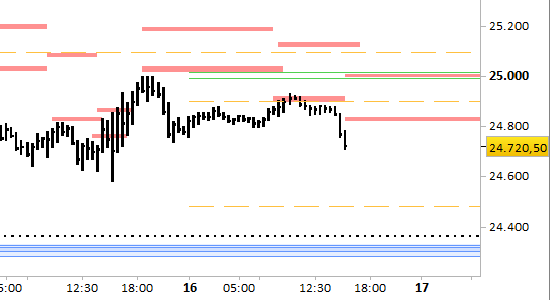 Il future sta seguendo la tendenza dominante (= 5–10 giornate e oltre), che vede un orientamento ribassista fino al supporto di medio periodo a 24300. Lo scenario è legittimato dalla tenuta della resistenza di medio periodo a 25500.00/25530.00. Solo una chiusura daily superiore alla resistenza potrebbe modificare le aspettative ribassiste di tendenza.