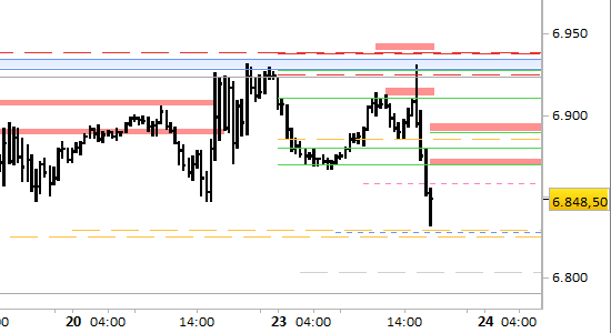 I prezzi hanno intercettato le prime proiezioni ribassiste a 6858.00, consentendo alle resistenze di brevissimo periodo (= 1–2 sedute) di abbassarsi fino a 6870.00 e 6895.00. Le proiezioni di brevissimo sono ancora ribassiste fino a 6828.00 e 6805.00, obiettivi aggiornati. Il segnale short in vigore è valido solo con prezzi stabilmente inferiori a 6895.00.