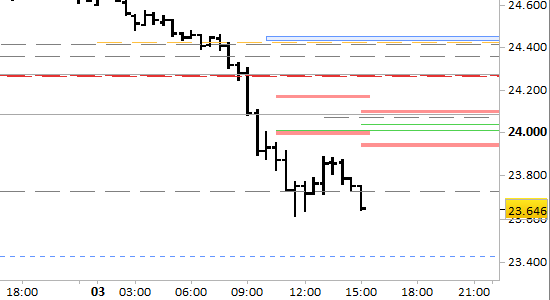 Per il breve periodo (= 1–2 sedute) le resistenze si sono abbassate a 23945 e 24090/110, punti di ripiegamento su eventuali recuperi. Le proiezioni sono ribassiste fino a 23435. Il segnale ribassista di breve periodo è attivo solo con rilevazioni stabilmente inferiori a 24110.