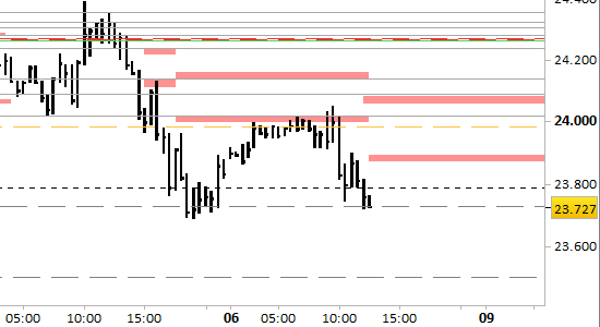 Confermiamo il target principale di breve periodo (1-2 sedute) a 23515. Le resistenze si sono abbassate a 23880/885 e 24095. Il segnale short rimane attivo nel breve periodo solo con rilevazioni stabilmente inferiori a 24095.
