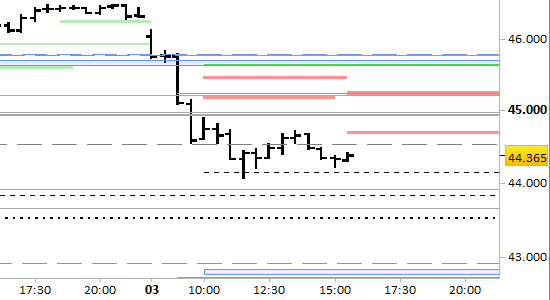 future FtseMib, grafico a barre da 30 minuti. Prezzi al 03/03/26, ore 15.36, last 44365
