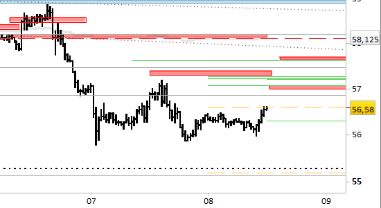 Le resistenze valide fino a domani si sono abbassate, portandosi a 56.99/57.08 e 57.60/57.71. Il target di brevissimo periodo è confermato a 55.32. Conserviamo la posizione short aperta ieri a 56.86; stop sopra 5771 senza attendere altre conferme.