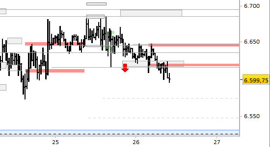 e.mini S&P future, grafico a barre da 30 minuti. Prezzi al 26/03/26, ore 9.47, last 6599.75