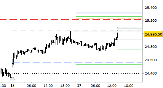 I prezzi hanno disatteso le aspettative di stabilizzazione di breve, forando al rialzo l’ex resistenza a 24915.00. I margini di espansione del recupero sono limitati dalle resistenze aggiornate a 25035.00/25040.00 e 25095.00/25100.00, che sono punti da cui ci aspettiamo la formazione di indicazioni ribassiste, coerenti con lo scenario di fondo. Attendiamo quindi la formazione di segnali short. Il supporto più vicino è posto adesso a 24905.00/24915.00 e lo spazio tra supporti e resistenze è una probabile zona distributiva a 1-2 sedute.