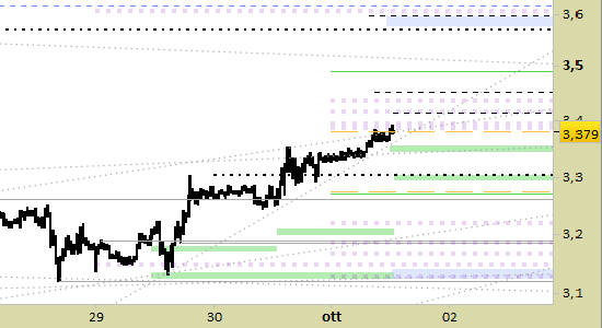I prezzi hanno intercettato il target principale di brevissimo periodo a 3.425, ove abbiamo liquidato la posizione long aperta ieri a 3.291.