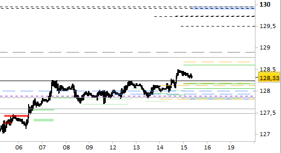 fino a domani, (=brevissimo periodo) i supporti si trovano invece a 128.15/18 e 127.80/85, quest'ultimo coincidente oggi con il supporto principale di tendenza. Le proiezioni sono rialziste fino a 128.60 e 128.90. Apriamo long su ritorni a 128.24; stop sotto 127.80 senza attendere alcuna conferma.
