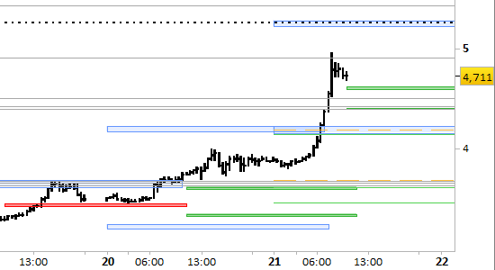 future natural gas, grafico a barre da 30 minuti. Prezzi al 21/01/26, ore 10.37, last 4.711