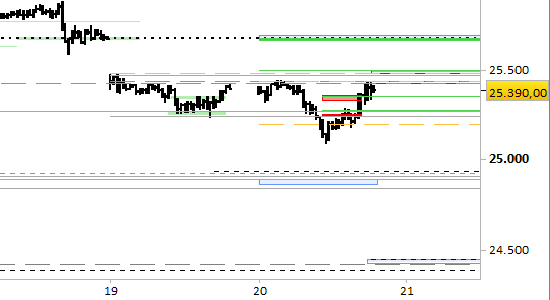 I prezzi hanno oltrepassato l'ex resistenza daily di quota 25355.00, imponendo un aggiornamento a tutti i livelli fino a domani. Le resistenze sono poste adesso a 24430.00/435.00 e 25490.00/505.00 e l'impostazione è ribassista fino a 24940.00. Sarà necessario aggiornare i livelli solo in caso di cedimento del primo supporto a 25310.00, o con prezzi superiori a 25505.00. Il segnale è short dalle resistenze o in violazione del supporto.