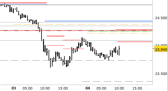 I prezzi sono riusciti ieri in serata a segnare massimi relativi a 24141, violando l'ex resistenza a 24110. I valori si sono subito riportati sotto al livello, ma è necessario comunque rivedere la disposizione dei riferimenti di breve periodo.