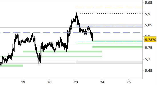 Le possibilità del mercato di cercare, fin dalla settimana in corso, di recuperare terreno fin oltre 5.8500 sono legate alla tenuta dei nuovi supporti di brevissimo periodo posti a 5.7770 e 5.7470/5.7530. I supporti costituiranno punti di probabile ripartenza del rialzo sulle debolezze fino all’aggiornamento di domani. Le proiezioni di brevissimo periodo sono favorevoli a un tentativo di rialzo fino a 5.9315, passando per un primo target a 5.8520. Il segnale rimarrà attivo solo con rilevazioni stabilmente superiori a 5.7470.