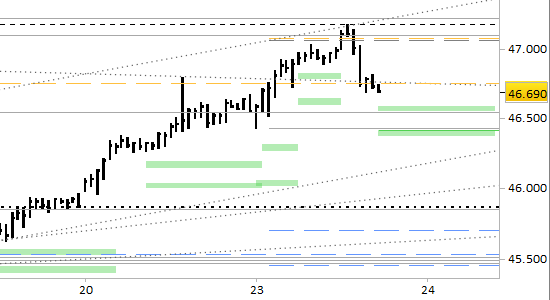 Attendiamo un riavvicinamento ai supporti aggiornati di breve periodo, posti a 46550/46570 e 46370/46390. Di seguito tecnicamente dovrebbe scattare un recupero fino a 47050/47070, resistenza e obiettivo. L'intero spazio fra 46370 e 47070 è area di stabilizzazione per la prima parte della settimana, in seno a un movimento rialzista dominante. Un ritorno dei valori a 46630 sarebbe già sufficiente a innescare un segnale long di brevissimo, valido solo con prezzi stabilmente superiori a 46370.