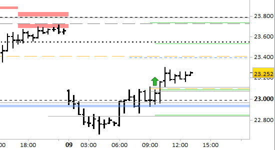Per quanto riguarda il breve periodo (=1-2 sedute) confermiamo spazi al rialzo fino a 23390 e 23525. I supporti si trovano a 23078/083 e 22840/850, punti di reazione in caso di arretramenti. Il segnale long è attivo solo con rilevazioni stabilmente superiori a 22840.
