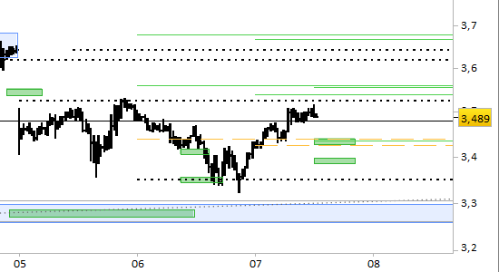 future natural gas, grafico a barre da 30 minuti. Prezzi al 07/01/26, ore 12.10, last 3.489