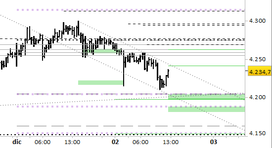 Future Gold, grafico a barre da 30 minuti. Prezzi al 02/12/25, ore 13.06, last 4234.7