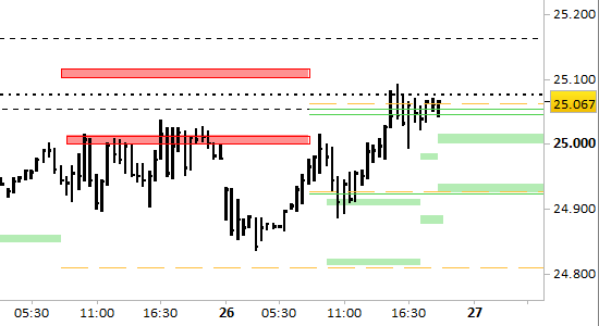 I prezzi sono ancora impegnati in fase di test della resistenza intermedia in area 25047/078. I supporti di brevissimo periodo (=fino a domani mattina) si sono alzati a 25005 e 24920. La tenuta dei supporti mantiene attivo uno scenario di probabile rottura rialzista con obiettivo a 25160/165. Lo scenario necessiterebbe di una revisione solo con rilevazioni inferiori a 24920.