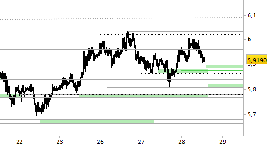 Per quanto riguarda i livelli di brevissimo periodo (=fino a domani) possiamo alzare i supporti a 5.8850 e 5.8060/8175. Ci aspettiamo l'avvio di una fase di stabilizzazione, mediante ripetuti cambi di tendenza, nello spazio fra i supporti e le resistenze di brevissimo poste a 6.0000 e 6.0350. Il movimento è preparatorio alla rottura rialzista con proiezioni aggiornate fino a 6.1350. Dovremmo rivedere tutti i livelli di brevissimo solo in caso di violazione di 5.8060.