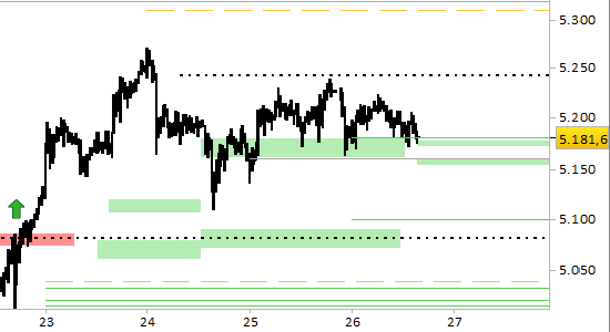 I supporti di brevissimo periodo, con valenza fino all'aggiornamento di domani, si sono alzati fino a 5180.0 e 5152.0. Il segnale rialzista risulta ancora attivo ma con obiettivi limitati a 5242.5 e 5307.5; in seguito dovremo attendere segnali. Il segnale long di breve rimane attivo solo con prezzi stabilmente superiori a 5152.0. Prezzi inferiori andrebbero probabilmente a testare la zona dei supporti inferiori, situati a 5100.0 e 5080.0, da cui sarebbe in seguito necessario attendere indicazioni di ripristino del rialzo.
