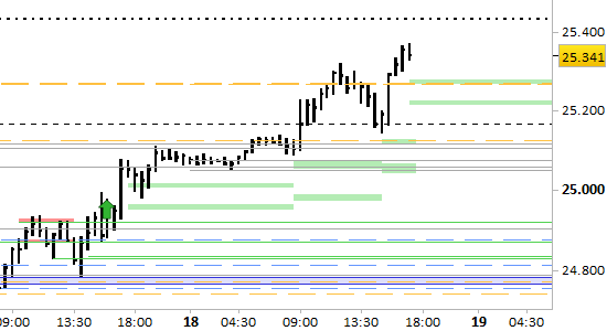 I supporti di brevissimo periodo (= fino a domani) si sono alzati a 25267/275 e 25215. Non ci sono indicazioni di esaurimento della spinta rialzista. Le proiezioni confermano un target sulla resistenza di brevissimo periodo a 25430/435. Il segnale long è attivo solo con prezzi stabilmente superiori a 25215.
