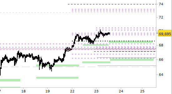 Sulla strada del rialzo sono concentrate numerose resistenze intermedie nella vicina area fra 69.15/69.90, già sotto pressione da ieri. È quindi ancora possibile un riavvicinamento provvisorio ai supporti in corso di giornata.