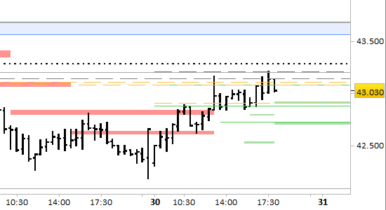 future FtseMib, grafico a barre da 30 minuti. Prezzi al 30/03/26, ore 18.22, last 43030