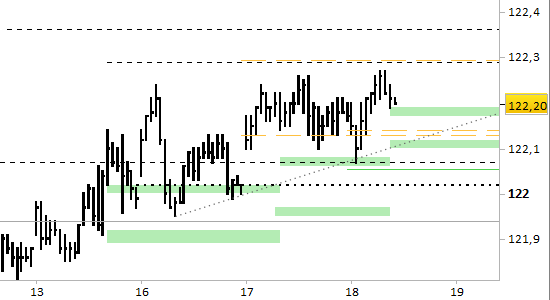 Con riferimento allo scenario di brevissimo periodo (= 1–2 sedute) confermiamo un segnale long ancora attivo, sorretto dai nuovi supporti aggiornati a 122.17/20 e 122.10. I prezzi si sono ulteriormente avvicinati alla resistenza di medio periodo ferma a 122.45/50, con massimi già toccati a 122.24. La semplice violazione di 122.10 interromperebbe il segnale long di brevissimo, aprendo spazio a un movimento correttivo che potrebbe evolvere in una fase di lateralità provvisoria. Stante la tenuta dei supporti, sono attive proiezioni confermate a 122.29 e 122.36.