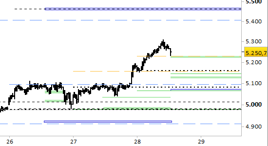 Future Gold, grafico a barre da 30 minuti. Prezzi al 28/01/26, ore 12.21, last 5250.7