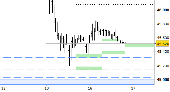 Il supporto principale fino a domattina (= brevissimo periodo) va aggiornato a 45470. Stante la tenuta del livello, tecnicamente ci sono ancora le condizioni per l’ampliamento del recupero tra stanotte e domani fino a 46085. Il segnale long di brevissimo periodo resta attivo solo con rilevazioni stabilmente superiori a 45470.