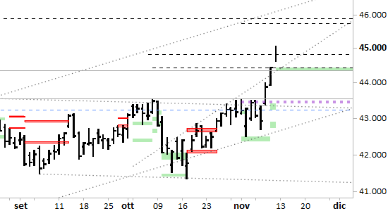 L'indice FtseMIB ha raggiunto nuovi massimi poco sopra i 45000 punti, consentendoci di alzare ulteriormente il supporto principale di breve periodo.