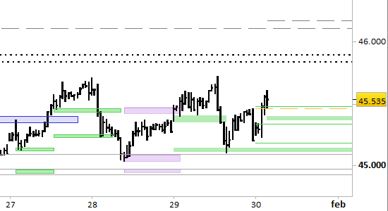 future FtseMib, grafico a barre da 30 minuti. Prezzi al 30/01/26, ore 10.27, last 45535