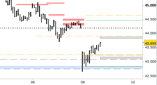 future FtseMib, grafico a barre da 30 minuti. Prezzi al 09/03/26, ore 13.18, last 43655