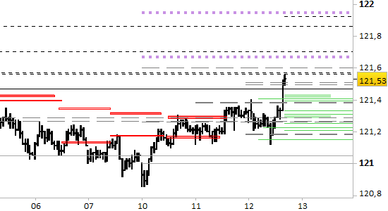 Sono presenti resistenze a 121.56/121.60 e 121.67/121.70, ma le proiezioni indicano obiettivi a 121.85 e 121.92/95.