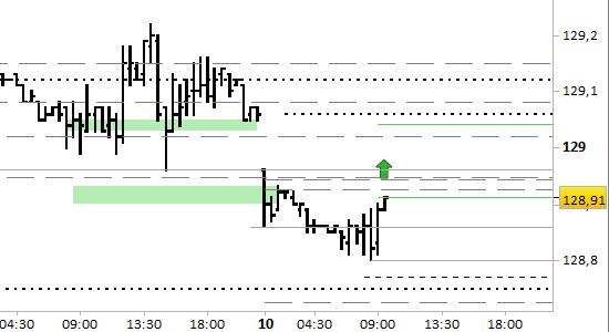 Apriamo long su superamento di 128.96; stop sotto 128.80 senza attendere alcuna conferma.