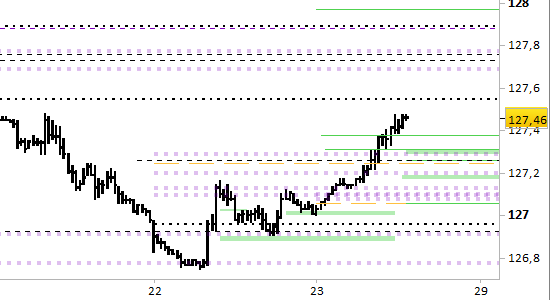 Il segnale è long a mercato e su ritorni al primo supporto. Stop sotto 127.16 senza attendere alcuna conferma.
