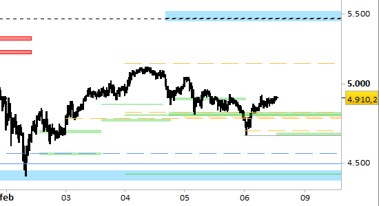 Per il brevissimo periodo (= fino a lunedì) i supporti principali si trovano a 4785.0/4805.0 e 4668.0/4688.0, punti di reazione in caso di arretramenti. L’orientamento è rialzista fino a 5138.0; il livello di verifica immediatamente successivo è posto direttamente sulla resistenza di medio periodo a 5470.0/5475.0. Lo scenario verrebbe annullato da minimi inferiori al secondo supporto.
