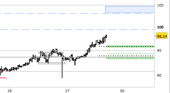 Dopo l'aggiornamento di ieri i prezzi hanno sviluppato un rapido arretramento fino a 89.51, salvo poi recuperare rapidamente fino a 97.97. È stato raggiunto solo il primo target ribassista di breve periodo a 90.40, ma non il principale a 89.35.