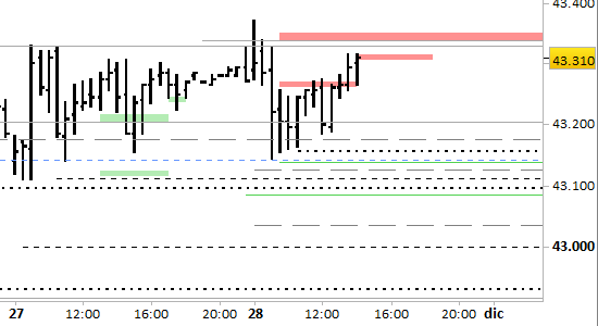 Regoliamo la prima resistenza a 43315 e confermiamo la principale a 43360.