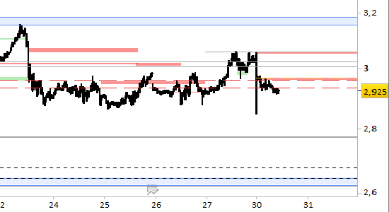 future natural gas, grafico a barre da 30 minuti. Prezzi al 30/03/26, ore 10.28, last 2.925