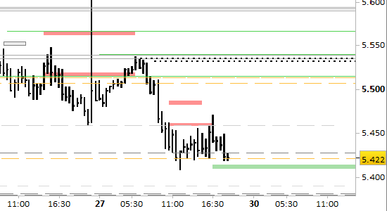 future Eurostoxx50, grafico a barre da 30 minuti. Prezzi fino al 27/03/26, ore 18.48, last 5422